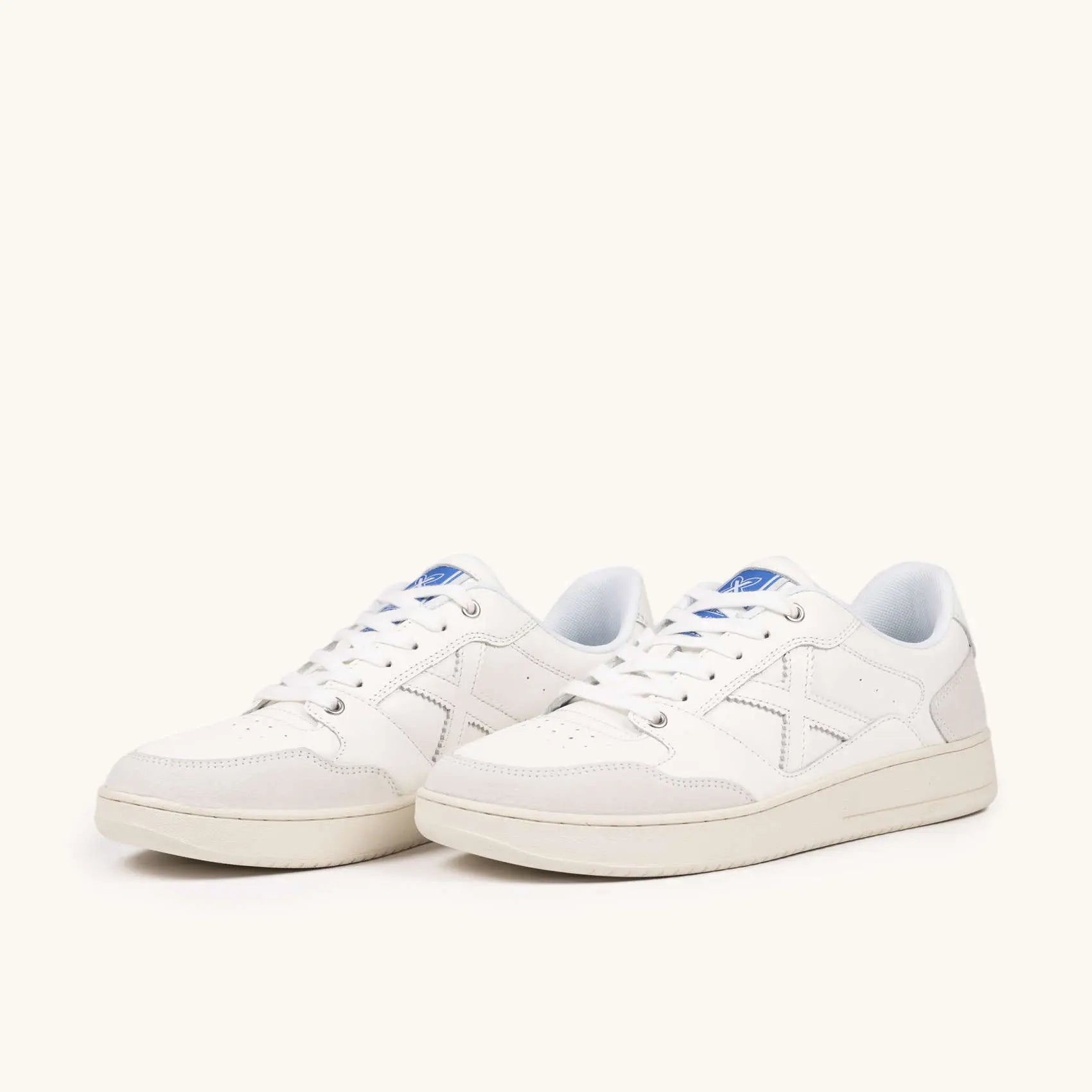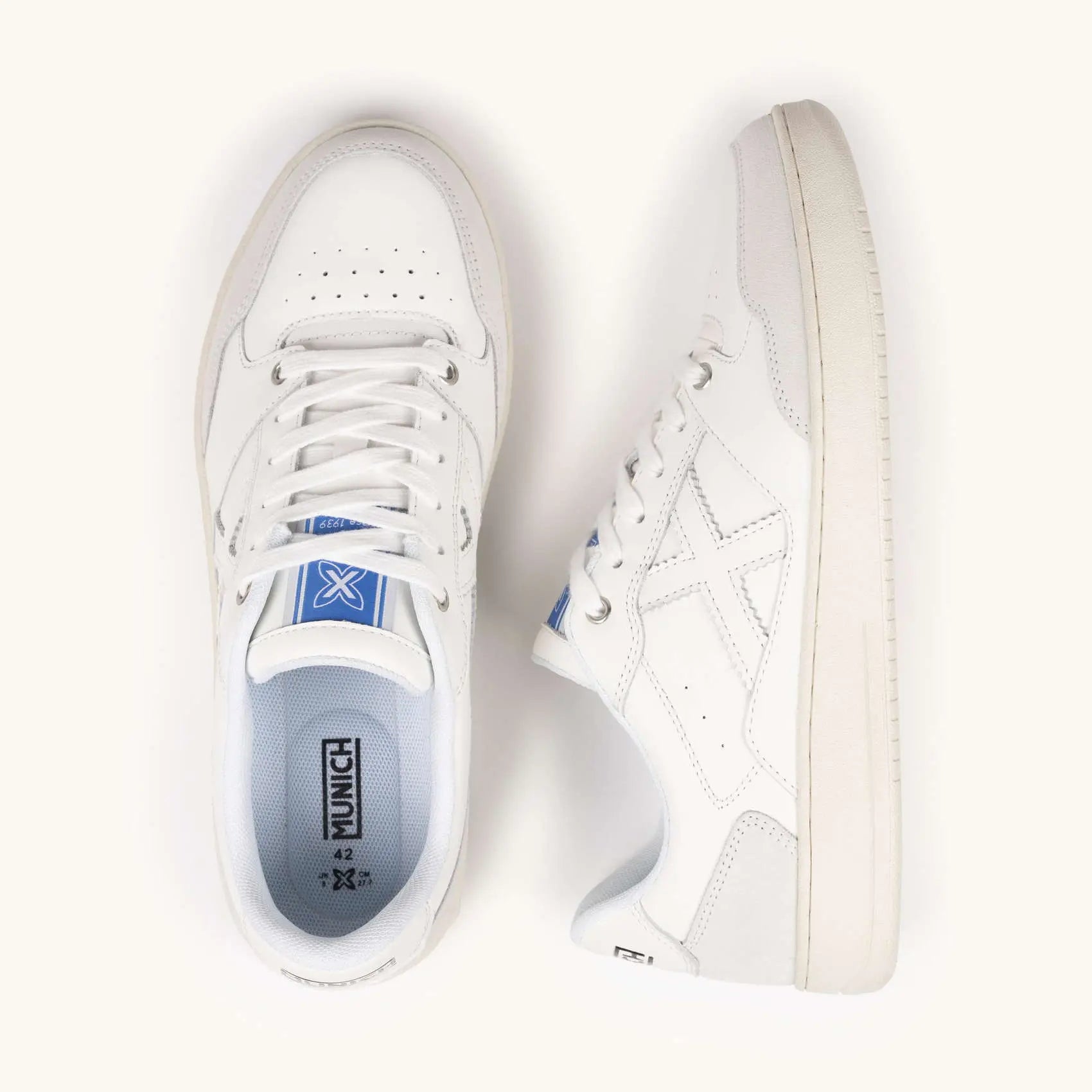 La MUNICH LEGIT MAN 115 cattura l'eleganza del tennis attraverso un design dallo stile contemporaneo che combina una base in pelle bianca con raffinati contrasti in blu navy e marrone.