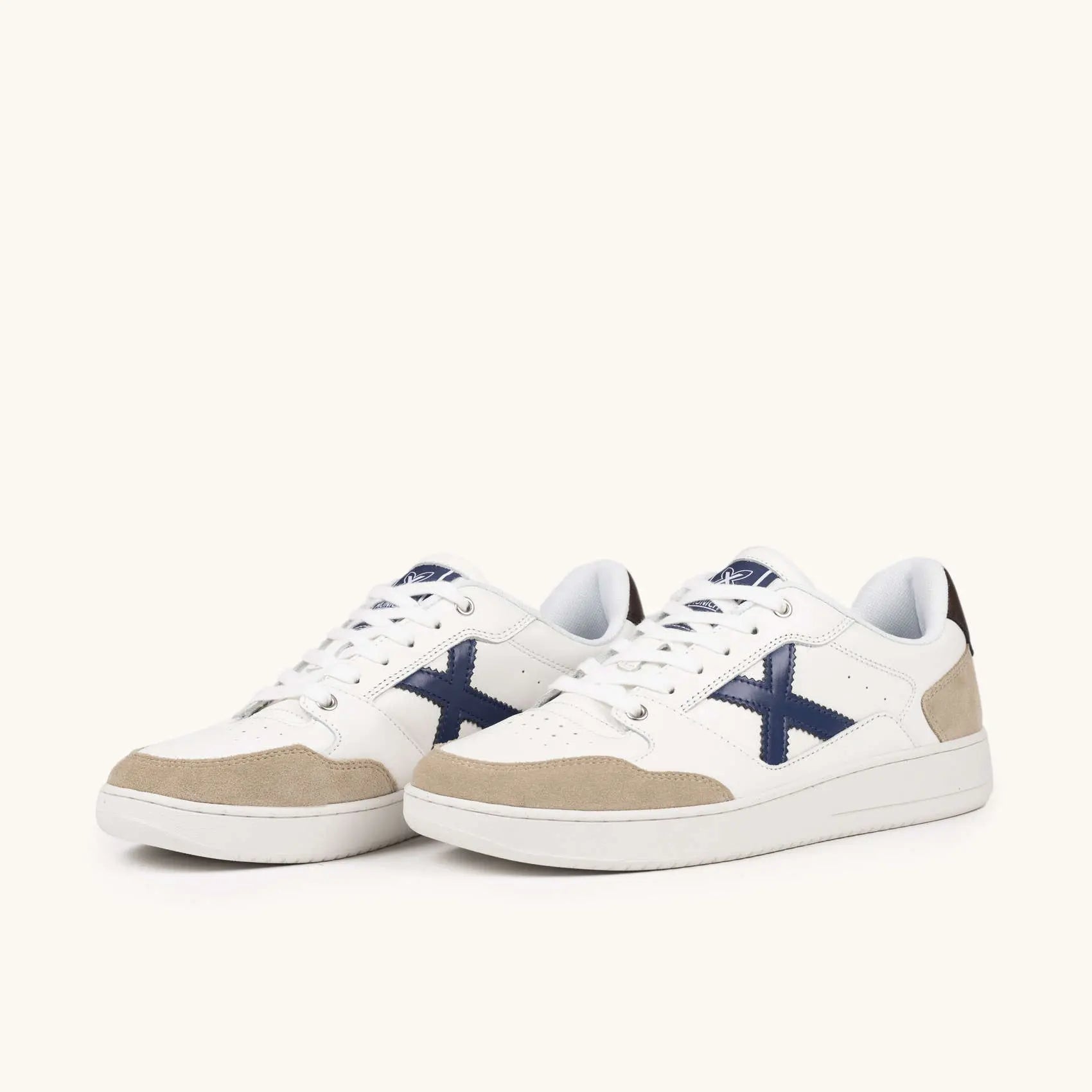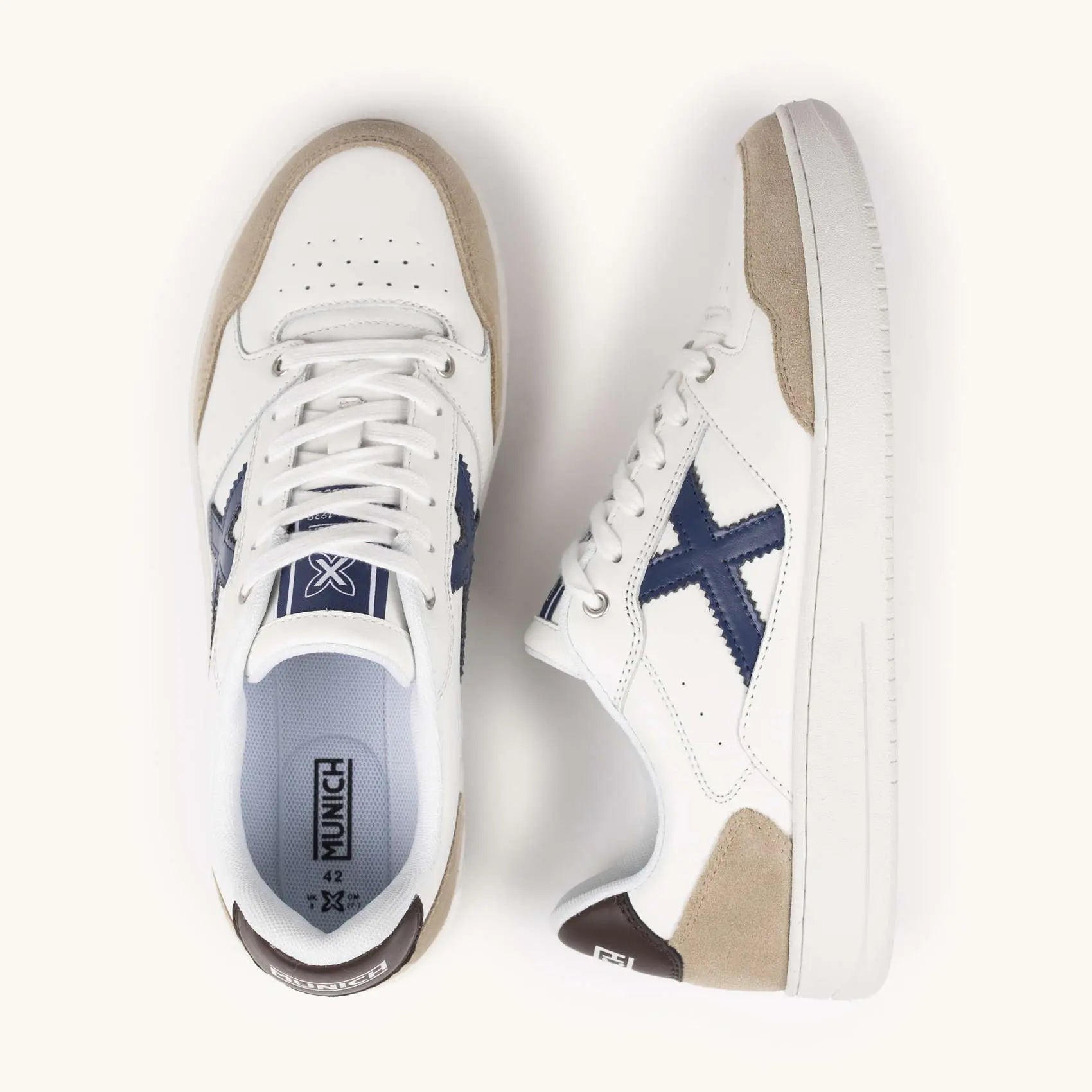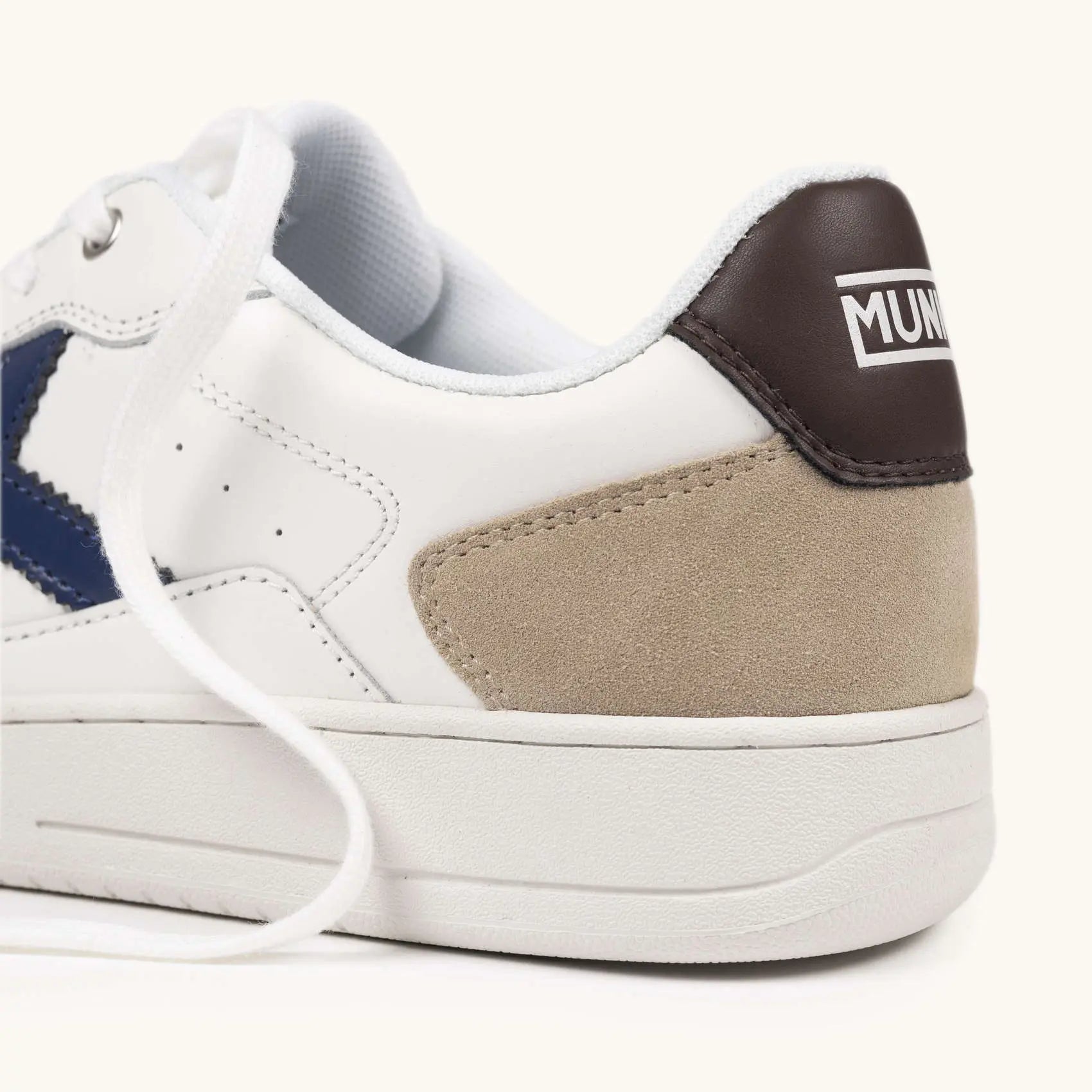 La MUNICH LEGIT MAN 115 cattura l'eleganza del tennis attraverso un design dallo stile contemporaneo che combina una base in pelle bianca con raffinati contrasti in blu navy e marrone.