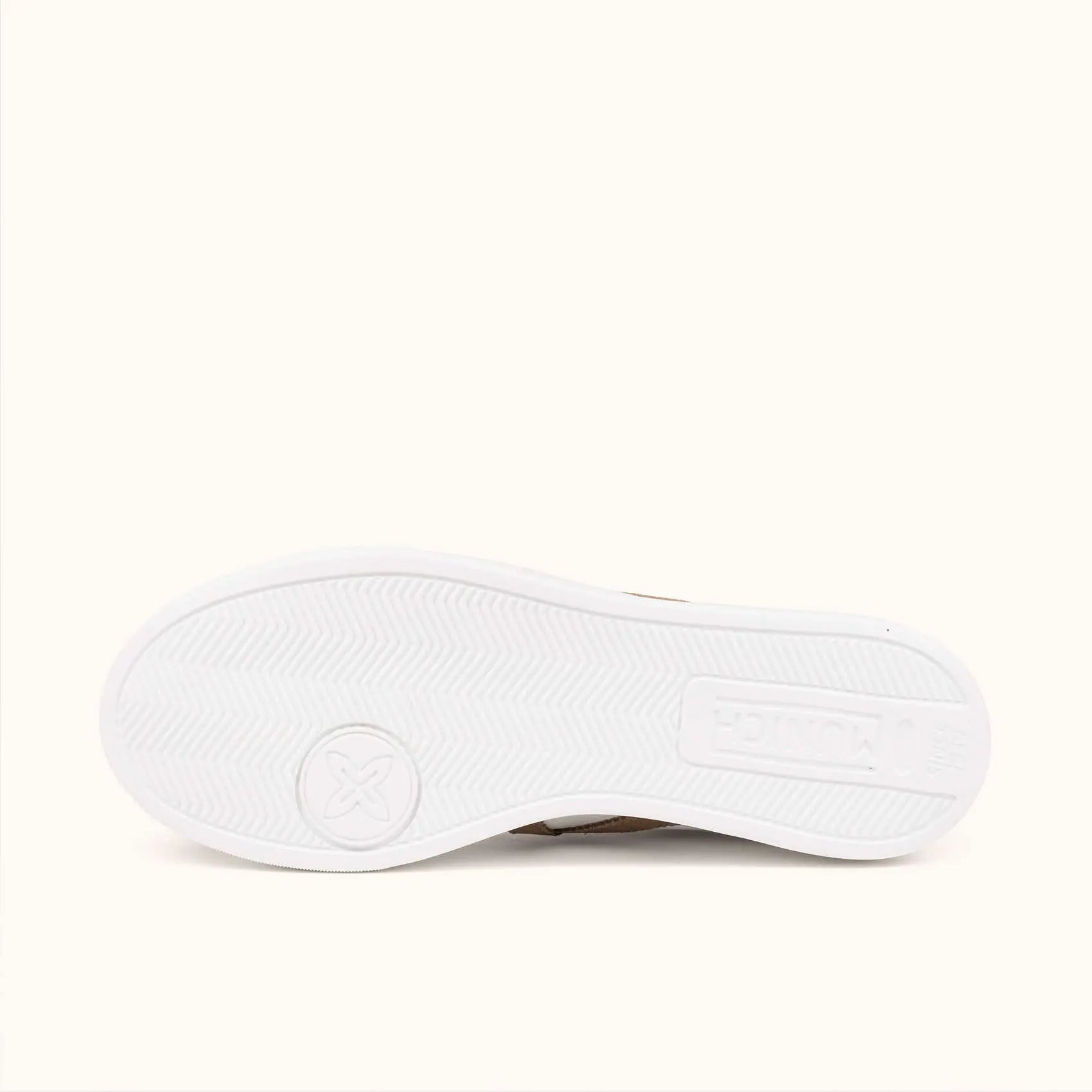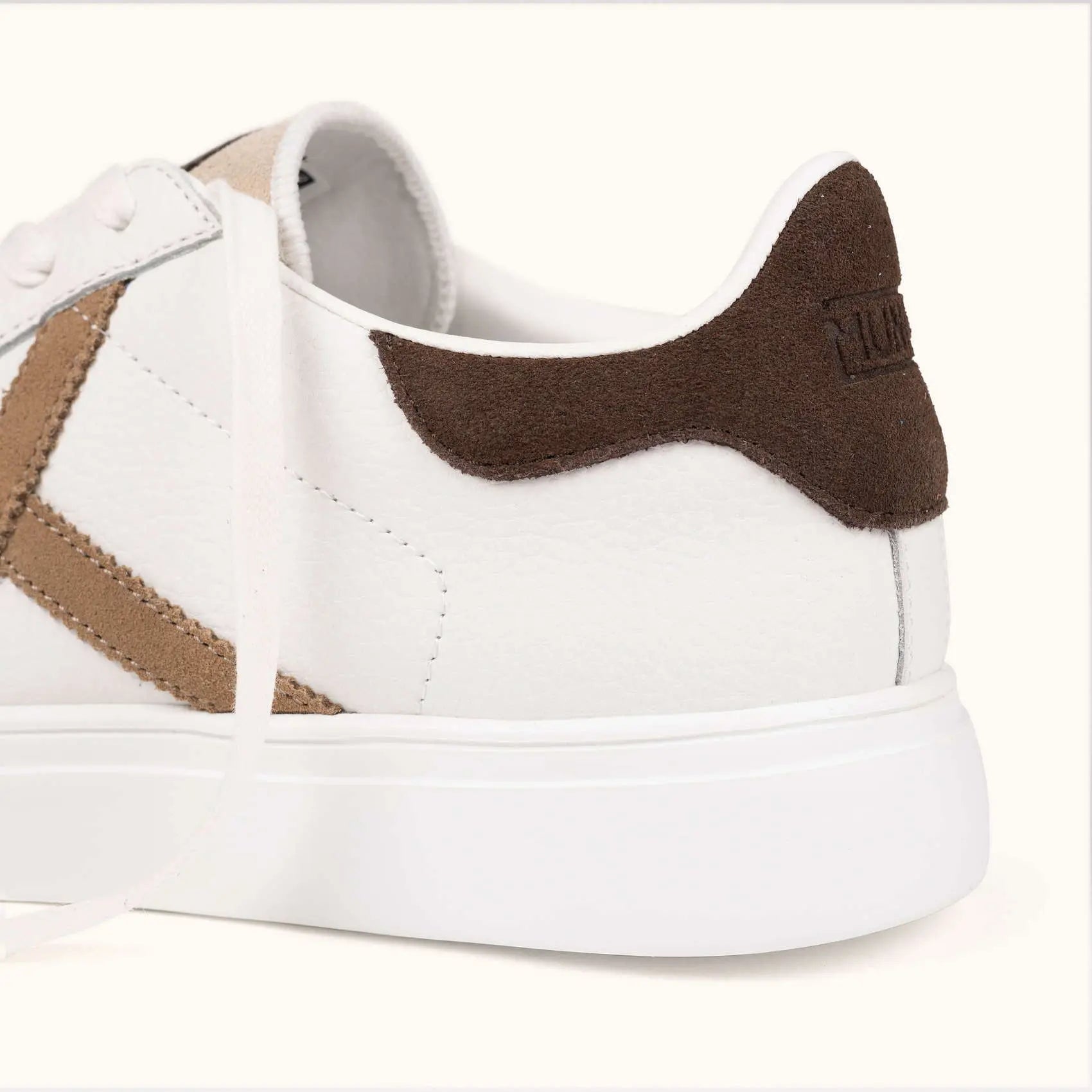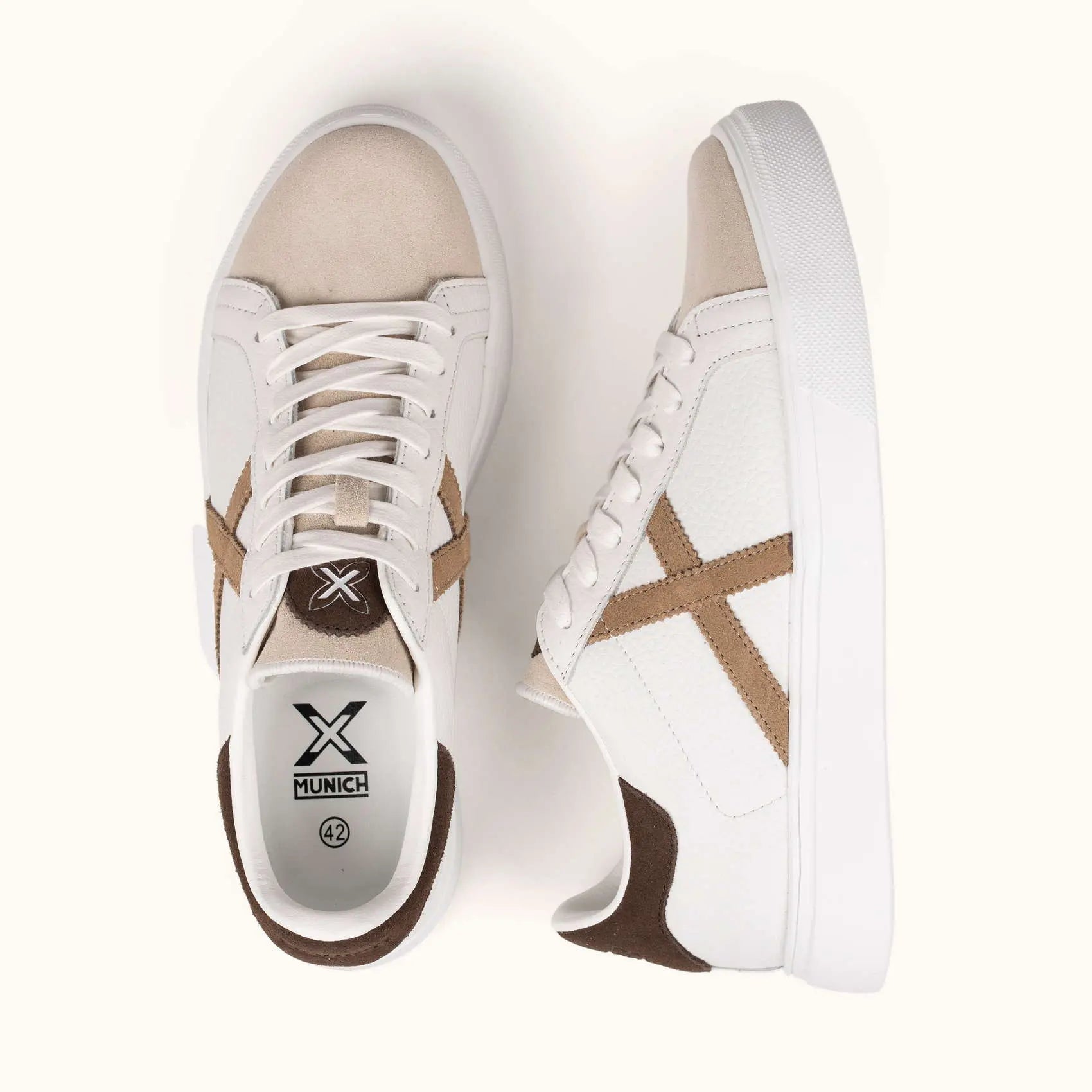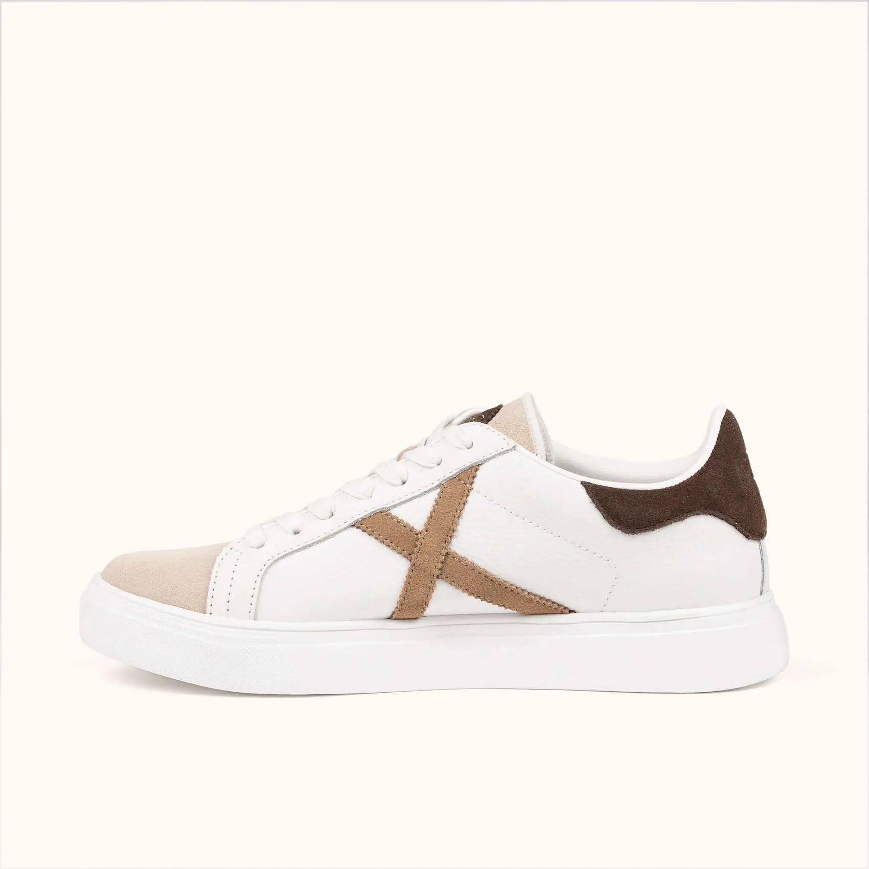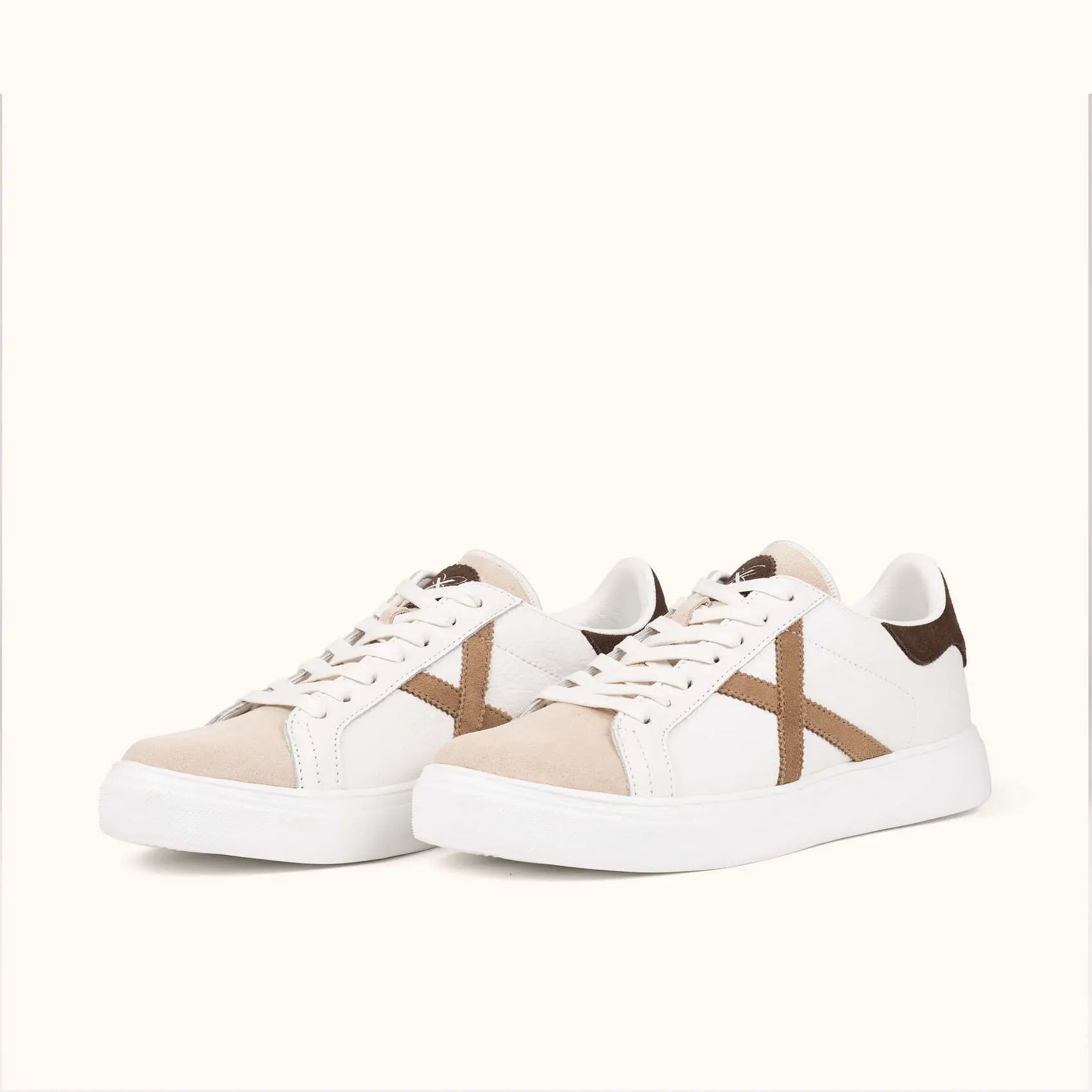 Queste sneakers in bianco si distinguono per la loro eleganza classica, incorporando una punta in pelle scamosciata beige morbido e un inserto posteriore in marrone scuro che contrasta perfettamente con l'emblematica X in tono terra.